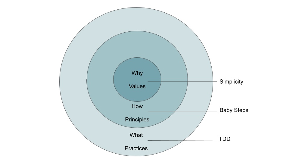 I feel, it is the same with teams that want to practice XP. Often it is useful to start with the practices, since they are more concrete. For example, you can start doing TDD even before you could understand the values of doing so. You can write a test - see it fail (bleeding red) - write the code - and see it pass. These are tangible things. The practices are activities that helps us in our day jobs. We spend most of our time in such practices. It is a very good place to start. But, if we don’t understand the values and principles behind them, we risk being dogmatic.